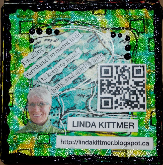 For obvious reasons, the top of "Self Portrait Cubed" includes my name, picture, Q code and blog address, which I cut out of one of my business cards. The final addition was a line of Pearl Paint around the edge of each of the sides.